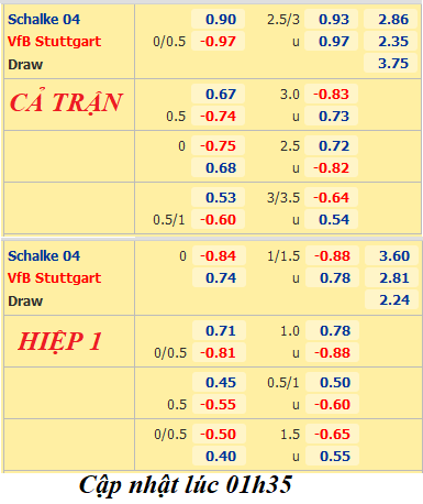 Mặc dù tiếp đón đội tân binh Stuttgart nhưng Schalke ngay từ thời điểm ban đầu đã bị nhà cái đánh giá thấp về khả năng giành chiến thắng khi đẩy xuống cửa dưới với kèo 1/4. Đáng nói, trong suốt quá trình giao dịch ở phiên cuối cùng trong ngày thi đấu, Hoàng đế Xanh không có chút cải thiện này về tỷ lệ.
