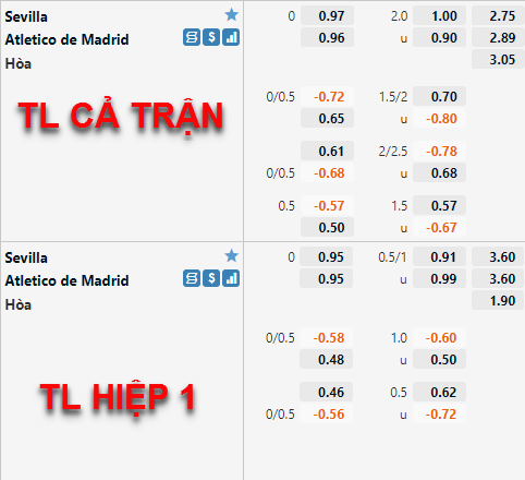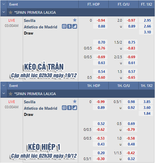 AEGoal chốt kèo bóng đá trực tiếp trận Sevilla vs Atletico Madrid diễn ra lúc 03h00 ngày 19/12 trong khuôn khổ giải VĐQG Tây Ban Nha sau khi dựa trên tính toán, chuyển động về kèo châu Á và đội hình ra sân của 2 đội.