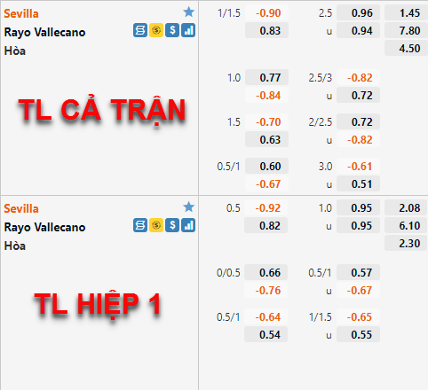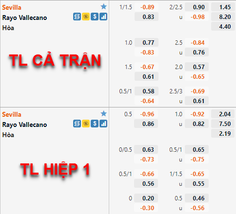 Tỷ lệ chấp Sevilla gần như không có biến động nào so với thời điểm chúng tôi cập nhật trước đây. Hiện tại đội chủ nhà vẫn đang duy trì mức chấp 1 1/4 và điểm ăn 2 cửa gần như không có biến động nào đáng kể. Bên phía tỷ lệ tài xỉu đã có những thay đổi tương đối lớn khi mốc chính 2 1/2 trước đây đã được nhà cái kéo xuống mức 2 1/4 với điểm ăn ít bên phía cửa tài.