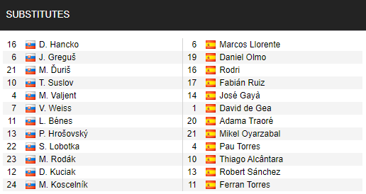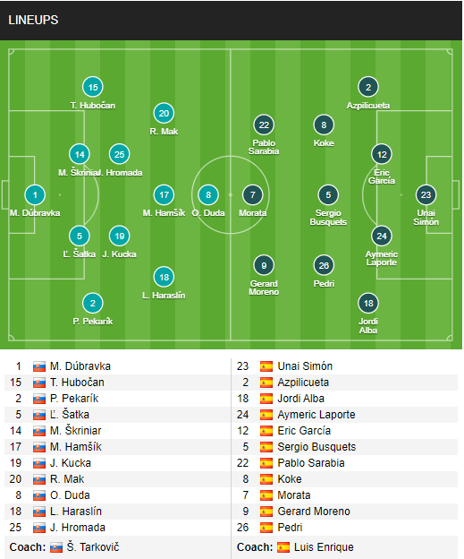 - Tây Ban Nha (4-3-3): Simon - Llorente, P.Torres, Laporte, Alba - Busquets, Koke, Pedri - Moreno, Morata, Olmo