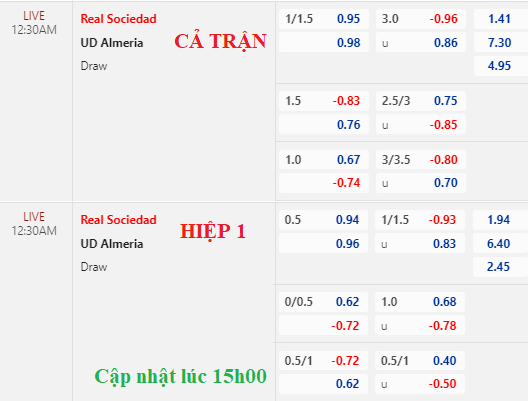 AEGoal chốt kèo bóng đá trực tiếp trận Sociedad vs Almeria diễn ra lúc 00h30 ngày 24/05/2023 trong khuôn khổ giải VĐQG Tây Ban Nha sau khi dựa trên tính toán, chuyển động về kèo châu Á và đội hình ra sân của 2 đội.
