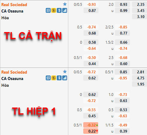 Tỷ lệ của Sociedad liên tiếp giảm điểm trong thời gian vừa qua, hiện tại đội chủ nhà chỉ còn duy trì mức chấp 1/4 thay cho mức chấp 1/2 ở lần chúng tôi cập nhật trước. Tương tự bên phía tỷ lệ tài xỉu của trận đấu, mốc 2 1/4 trước đây đã được thay thế bằng mốc 2 hoà ở thời điểm hiện tại.