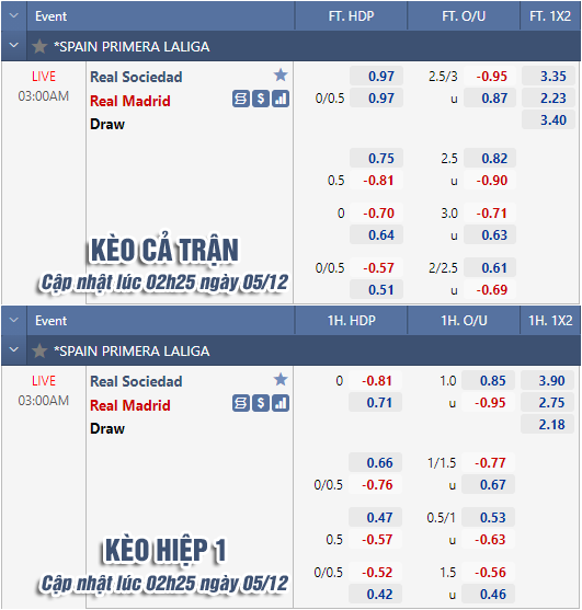 AEGoal chốt kèo bóng đá trực tiếp trận Sociedad vs Real Madrid diễn ra lúc 03h00 ngày 5/12 trong khuôn khổ giải VĐQG Tây Ban Nha sau khi dựa trên tính toán, chuyển động về kèo châu Á và đội hình ra sân của 2 đội.