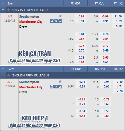 * Chốt kèo trận Southampton vs Man City (00h30 ngày 23/01)