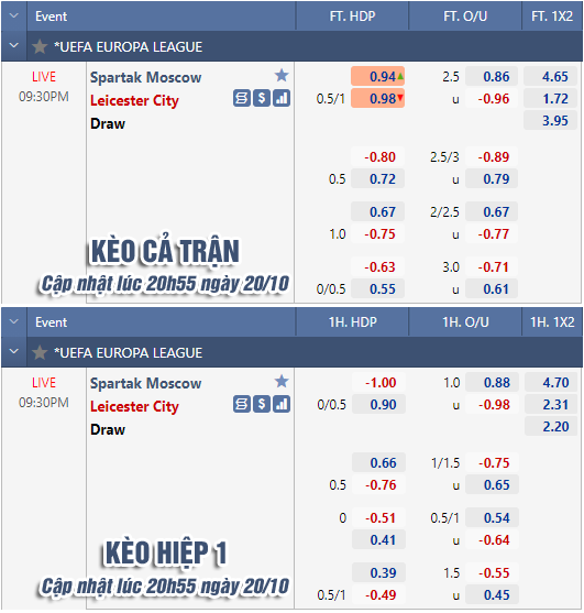 * Chốt kèo trận Spartak Moscow vs Leicester City (21h30 ngày 20/10)