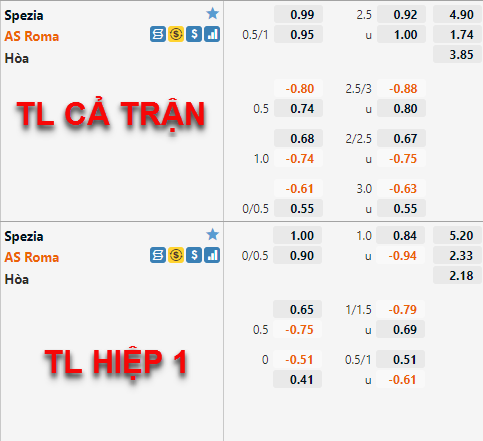 Tỷ lệ chấp của trận đấu không có nhiều biến động thời gian vừa qua, hiện tại AS Roma vẫn đang duy trì mức chấp 3/4 và điểm ăn của cửa trên đã được điều chỉnh giảm đôi chút. Trong khi đó bên phía tỷ lệ tài xỉu của trận đấu có những biến động rõ rệt hơn khi mốc chính 2 3/4 trước đây đã được thay thế bằng mốc 2 1/2 ở thời điểm hiện tại.