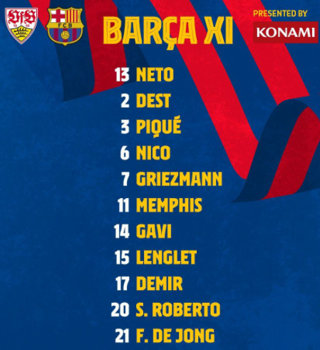 - Barcelona (4-3-3): Pena - Dest, Pique (c), Umtiti, Balde - Roberto, Pjanic, Puig - Demir, Manaj, Memphis