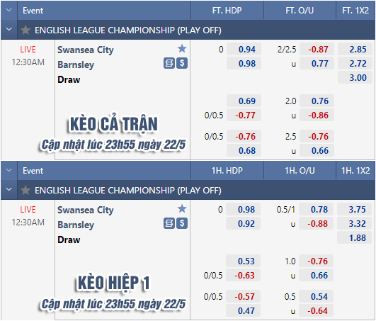 * Chốt kèo trận Swansea City vs Barnsley (00h30 ngày 23/5)