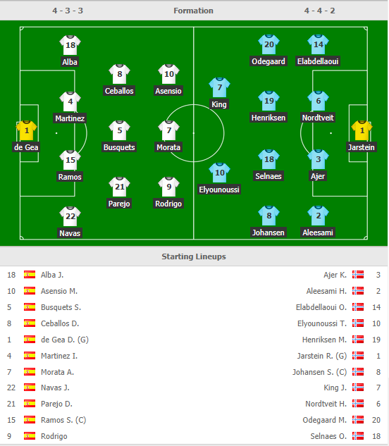 HLV Enrique sử dụng những cái tên như Morata, Rodrigo, Asensio hay Ceballos. Đây là những cầu thủ không được đá chính nhiều và cũng có phong độ không tốt thời gian gần đây. Na Uy không phải đối thủ dễ chơi và họ cho thấy sự tiến bộ thời gian qua, nhất là tại Nations League mới đây. Sẽ khó cho "bò tót" có thể thắng đậm trong cuộc chiến này!