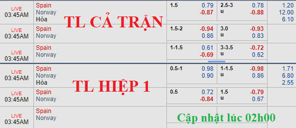 Kèo chấp 1 3/4 lúc 10h sáng ngày 23/03 của Tây Ban Nha tiếp tục bị kéo xuống chỉ còn 1 1/2 dù rằng điểm ăn lúc này đang thấp. Mốc tài xỉu theo đó cũng bị điều chỉnh từ 3 hòa về còn 2 3/4. Mặc dù có được lợi thế sân nhà nhưng việc Tây Ban Nha mất giá cho thấy cửa trên thực sự không khả quan trong trận này.
