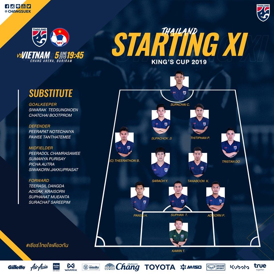 Đội hình ra sân của Thái Lan ở cuộc tiếp đón Việt Nam vẫn sử dụng đội hình quen thuộc 3-4-2-1 dưới thời HLV Yodyadthai. Hàng thủ vẫn là những Hemviboon, Pansa, Promrak; 2 cánh là Tristan Do và Buntaman; tuyến giữa là Sarach, Tanaborn, Thitipan, và Sarachat. Chỉ có trên hàng công, Supachai là cái tên đá chính chứ không phải Adisak Kraison hay Teerasil Dangda. Rõ ràng, đây vẫn là đội hình đầy chất lượng của Thái Lan dù không có sự phục vụ của ngôi sao Songkrasin.