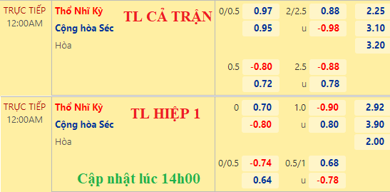 Trên sàn châu Á, Thổ Nhĩ Kỳ vẫn chấp đồng banh và điểm ăn cho họ có giảm so với chiều nay. Trong khi ấy thì tài xỉu vẫn ở mức 2 1/4 với lợi nhuận thấp hơn cho lựa chọn tài. Nhìn chung việc Thổ Nhĩ Kỳ tăng giá cũng không quá bất ngờ, khi họ được chơi trên sân nhà. Tuy nhiên thì dịch chuyển chưa đáng kể, nhất là trong thời điểm Thổ Nhĩ Kỳ có phong độ rất thất thường.