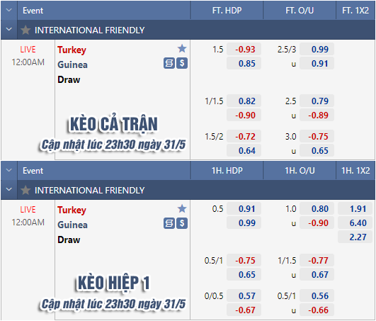 * Chốt kèo trận Thổ Nhĩ Kỳ vs Guinea (00h00 ngày 01/6)