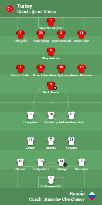 Nga: Guilherme (GK); Vyacheslav Karavaev, Georgiy Dzhikiya, Igor Diveev, Yuri Zhirkov; Roman Zobnin, Zelimkhan Bakaev, Aleksey Miranchuk; Anton Miranchuk, Fedor Chalov, Denis Cheryshev
