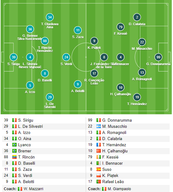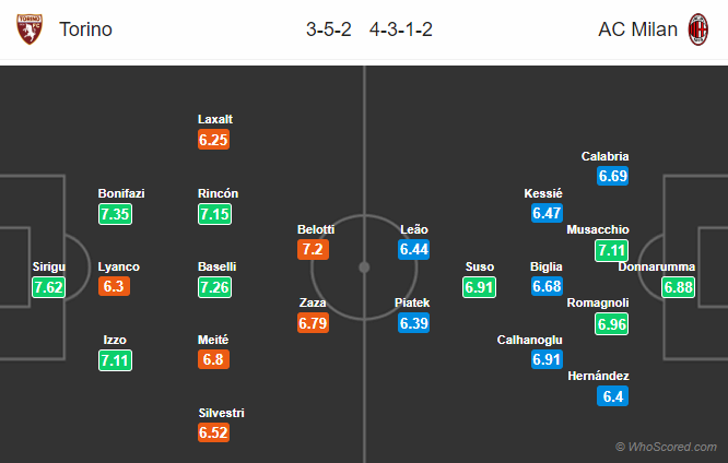 Bên cạnh đó, mặc dù cả 2 đều tung ra sân những cầu thủ tấn công tốt nhất của mình, cụ thể như bên Torino là Zaza và Belotti, còn AC Milan là Piatek, Suso hay Calhanoglu, thế nhưng với phong độ nghèo nàn từ đầu mùa cùng việc cả 2 đều sử dụng đội hình không quá thiên về tấn công, lại thêm mốc tổng bàn thắng cả trận vẫn giữ ở mức 2 1/4 cùng thang điểm ăn không quá chênh lệch, sẽ khó mà hy vọng vào kịch bản bùng nổ bàn thắng ở trận này.