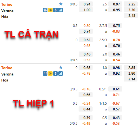 Hiện tại đội chủ nhà Torino vẫn đang có tỷ lệ chấp chính là 1/4 như thời điểm chúng tôi cập nhật trưa nay và điểm ăn của 2 cửa cũng không có nhiều biến động so với trước đây. Bên phía tỷ lệ tài xỉu cũng có những diễn biến tương tự khi mốc 2 1/2 vẫn là mốc chính của trận đấu và điểm ăn cũng gần như không có biến động nào.
