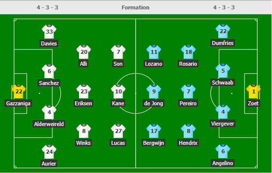 HLV Pochettino tung vào sân đội hình rất mạnh bao gồm cả Harry Kane, Son Heung-Min, Lucas Moura, Eriksen lẫn D.Alli. Điều này cho thấy chiến lược gia người Argentina quyết tâm tìm kiếm chiến thắng nhằm níu kéo hy vọng vượt qua vòng bảng vốn rất nhỏ. Trong khi bên kia chiến tuyến, PSV vẫn đá với sơ đồ 4-3-3 quen thuộc.
