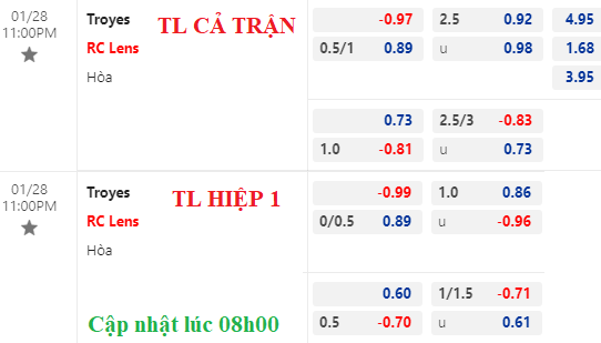 Trên sàn châu Á, Lens lên chấp 1 hòa nhưng bỏ sâu, trong khi tài xỉu vẫn là 2 1/2. Tuy kèo cả trận nhích lên nhưng kèo hiệp 1 Lens vẫn chỉ chấp đồng banh, đó là tỷ lệ chưa khả quan dành cho khách trước đối thủ thua kém nhiều bậc.