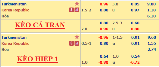 AEGoal.net chốt kèo trực tiếp trận Turkmenistan vs Hàn Quốc diễn ra lúc 21h00 ngày 10/9 sau khi dựa trên tính toán, chuyển động về kèo châu Á và đội hình ra sân của 2 đội.