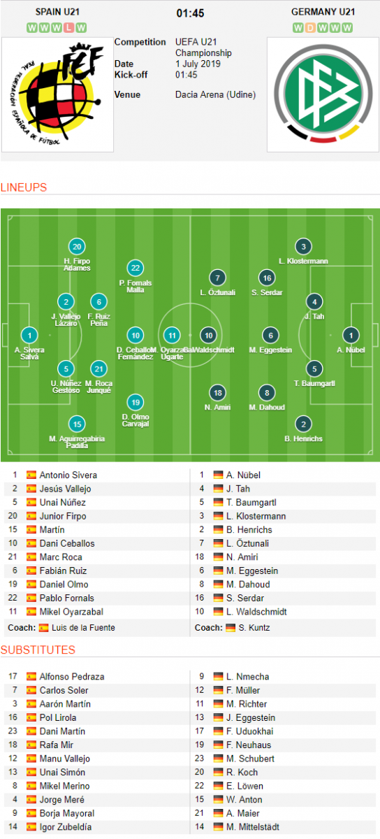 * Trong 12 lần đụng độ trước đây, U21 Tây Ban Nha thắng 6 còn U21 Đức thắng 4 trận.