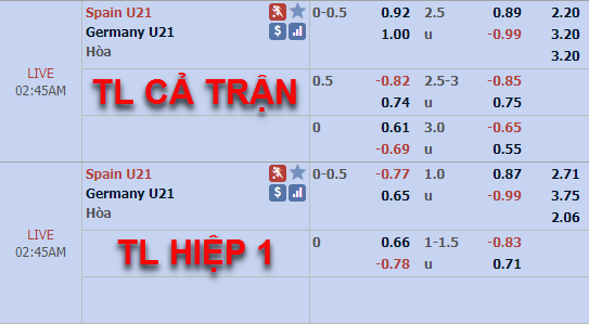 Trên sàn giao dịch châu á, tỷ lệ của trận đấu đã có những biến động đáng kể. Mức tỷ lệ chính của trận đấu vẫn đang được giữ ở mức chấp 1/4 của U21 Tây Ban Nha nhưng điểm ăn của cửa trên đã được điều chỉnh tăng đáng kể. Những diễn biến của thị trường đem lại dấu hiệu không tốt cho lựa chọn cửa trên, nhưng theo chúng tôi U21 Tây Ban Nha vẫn là đội bóng đang tin khi có thành tích xuất sắc kể từ đấu giải đấu.