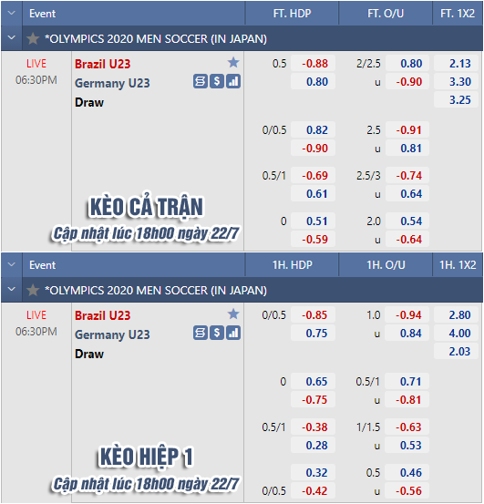 * Chốt kèo trận U23 Brazil vs U23 Đức (18h30 ngày 22/7)
