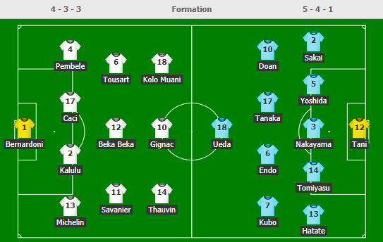 U23 Pháp vẫn có đầy đủ trụ cột như Thauvin, Gignac hay Tousart và họ chơi với sơ đồ 4-3-3. Trong khi đó, U23 Nhật Bản thi đấu với chiến thuật 5-4-1 và họ cũng có nhiều nhân tố chủ chốt như Kubo, Tomiyasu hay Yoshida.