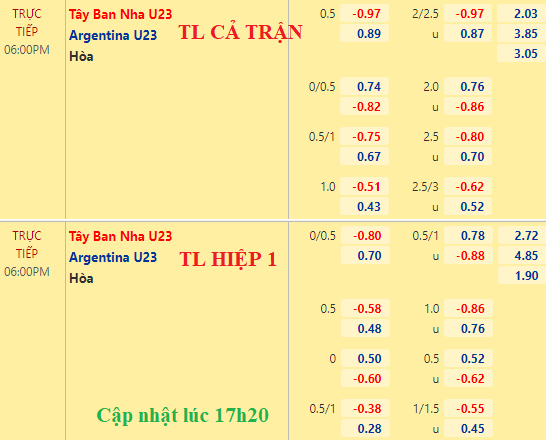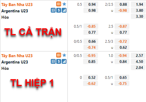 So với thời điểm sáng nay, U23 Tây Ban Nha vẫn chấp hòa nhưng điểm ăn cho họ đã tiến đến mức bỏ. Trong khi đó thì mức tài xỉu 2 1/4 ghi nhận lợi nhuận cho cửa tài từ mức ăn ít lên mức bỏ. Khả năng tấn công của đôi bên vẫn chưa thực sự sắc sảo và với tỷ lệ như vậy thì lựa chọn xỉu khả dĩ hơn.