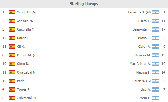 U23 Tây Ban Nha vẫn có đầy đủ ngôi sao ở trận này như Pedri, Oyarzabal hay Dani Olmo. Asensio cũng trở lại đội hình xuất phát ở trận này. Bên phía U23 Argentina, không có nhiều cái tên được NHM biết đến.