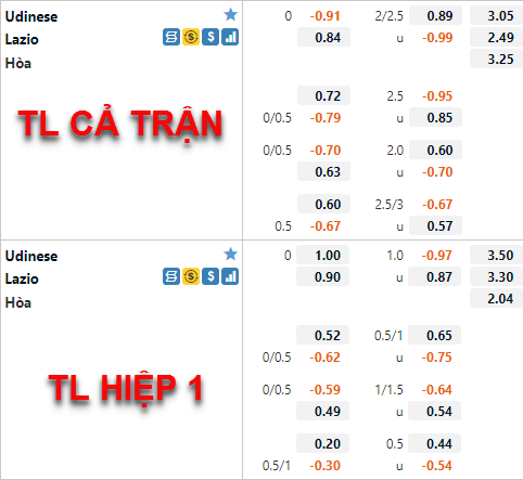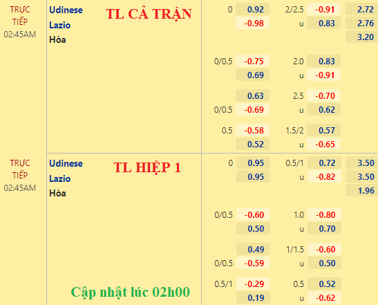 Nếu như thời điểm AEGoal update tỷ lệ sớm, Lazio còn chấp về giá thì trước giờ bóng lăn chừng 45p, Udinese mới là đội chấp về giá. Mức tài xỉu 2 1/4 cũng ghi nhận điểm ăn cho cửa tài tiến đến mức bỏ sâu.