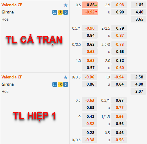 Tỷ lệ chấp chính của Valencia vẫn được duy trì ở mức 1/2 như thời điểm chúng tôi cập nhật sáng nay, điểm ăn của cửa trên đã được điều chỉnh giảm nhưng không quá nhiều. Trong khi đó mốc tài xỉu có những thay đổi rõ rệt hơn khi mốc 2 1/4 trước đây đã được thay thế bằng mốc 2 1/2 ở thời điểm hiện tại.