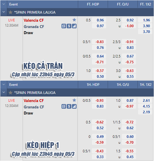 AEGoal chốt kèo bóng đá trực tiếp trận Valencia vs Granada diễn ra lúc 00h30 ngày 06/03 trong khuôn khổ giải VĐQG Tây Ban Nha sau khi dựa trên tính toán, chuyển động về kèo châu Á và đội hình ra sân của 2 đội.