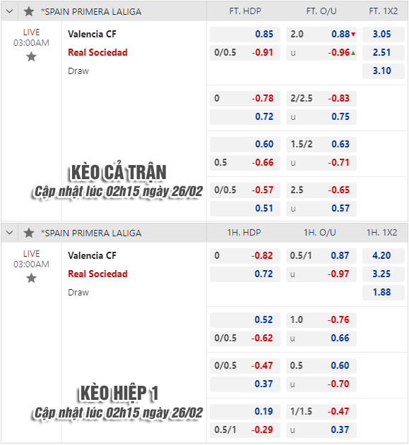 AEGoal chốt kèo bóng đá trực tiếp trận Valencia vs Sociedad diễn ra lúc 03h00 ngày 26/02/2023 trong khuôn khổ giải VĐQG Tây Ban Nha sau khi dựa trên tính toán, chuyển động về kèo châu Á và đội hình ra sân của 2 đội.