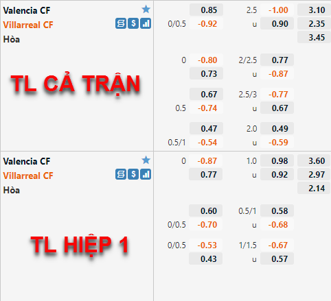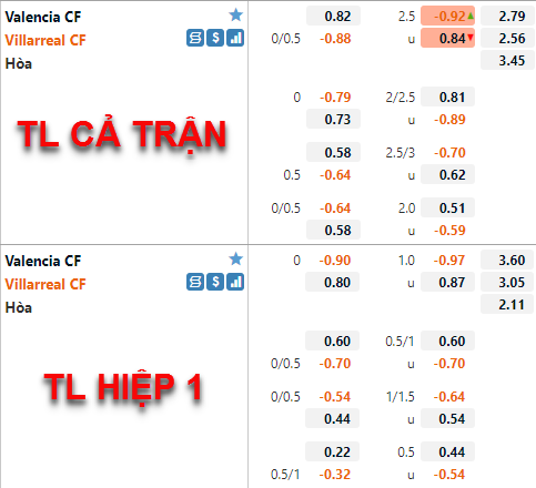 Tỷ lệ chấp chính của Villarreal vẫn được duy trì ở mức 1/4 như thời điểm trước đây nhưng hiện tại điểm ăn của cửa dưới đã được điều chỉnh giảm đôi chút. Tương tự bên phía tỷ lệ tài xỉu, mốc 2 1/4 vẫn là mốc chính của trận đấu và điểm ăn cửa xỉu cũng đã được điều chỉnh giảm.