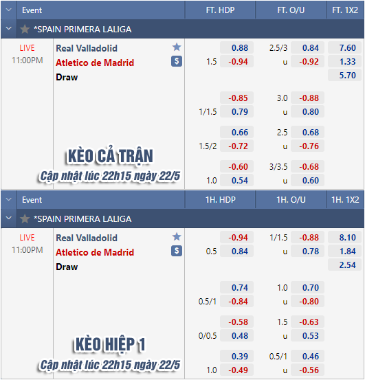 AEGoal chốt kèo bóng đá trực tiếp trận Valladolid vs Atletico Madrid diễn ra lúc 23h00 ngày 22/05 trong khuôn khổ giải VĐQG Tây Ban Nha sau khi dựa trên tính toán, chuyển động về kèo châu Á và đội hình ra sân của 2 đội.