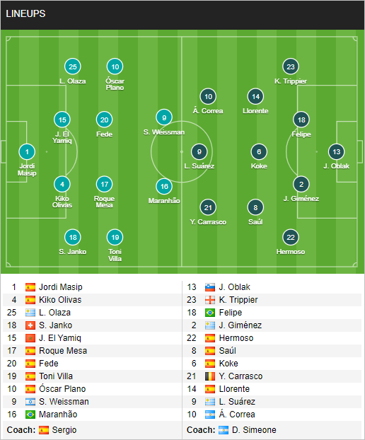 Atletico Madrid: Stefan Savic dính án treo giò; trong khi Thomas Lemar vẫn bỏ ngỏ khả năng có mặt.