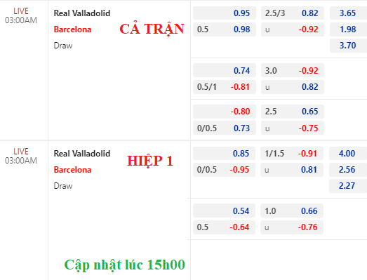 AEGoal chốt kèo bóng đá trực tiếp trận Valladolid vs Barcelona diễn ra lúc 03h00 ngày 24/05/2023 trong khuôn khổ giải VĐQG Tây Ban Nha sau khi dựa trên tính toán, chuyển động về kèo châu Á và đội hình ra sân của 2 đội.