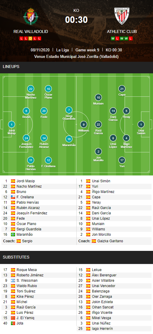 - Valladolid: Vắng Kiko Olivas (chấn thương); Khả năng ra sân của Javi Sanchez còn bỏ ngỏ.
