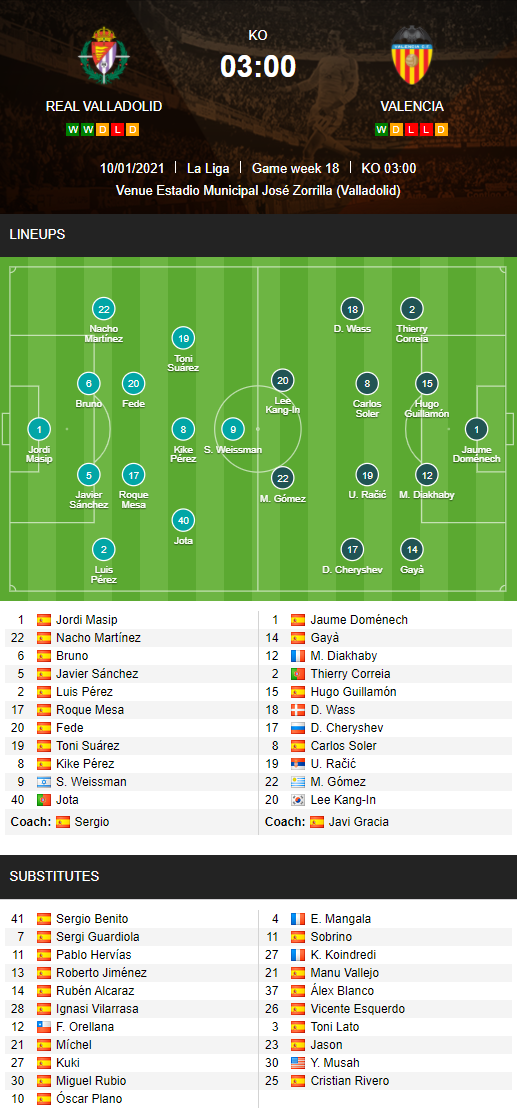 AEGoal chốt kèo bóng đá trực tiếp trận Valladolid vs Valencia diễn ra lúc 03h00 ngày 11/1 trong khuôn khổ giải VĐQG Tây Ban Nha sau khi dựa trên tính toán, chuyển động về kèo châu Á và đội hình ra sân của 2 đội.
