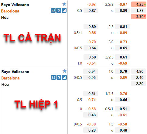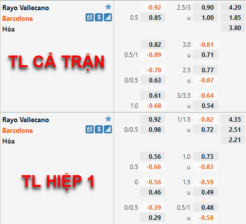Hiện tại Barcelona vẫn đang duy trì mức chấp 1/2 trên sàn giao dịch châu Á và mức điểm ăn của hai cửa cũng gần như không có biến động nào đáng kể so với thời điểm chúng tôi cập nhật chiều nay. Bên phía tỷ lệ tài xỉu của trận đấu thậm chí còn có xu hướng giảm điểm, mốc 2 3/4 vẫn là mốc chính của trận đấu nhưng điểm ăn của cửa tài đã được điều chỉnh tăng rõ rệt so với trước đây.