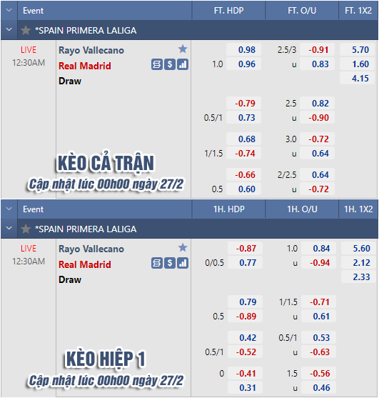 * Chốt kèo trận Vallecano vs Real Madrid (0h30 ngày 27/2)