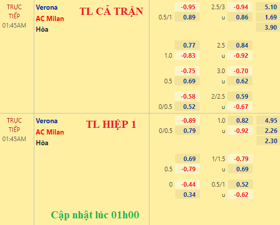 AEGoal chốt kèo bóng đá trực tiếp trận Verona vs AC Milan diễn ra lúc 01h45 ngày 09/05 trong khuôn khổ giải VĐQG Italia sau khi dựa trên tính toán, chuyển động về kèo châu Á và đội hình ra sân của 2 đội.