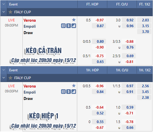 AEGoal chốt kèo bóng đá trực tiếp trận Verona vs Empoli diễn ra lúc 21h00 ngày 15/12 trong khuôn khổ Cúp QG Italia sau khi dựa trên tính toán, chuyển động về kèo châu Á và đội hình ra sân của 2 đội.