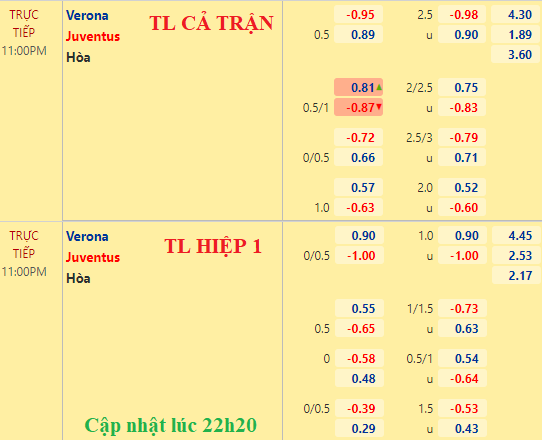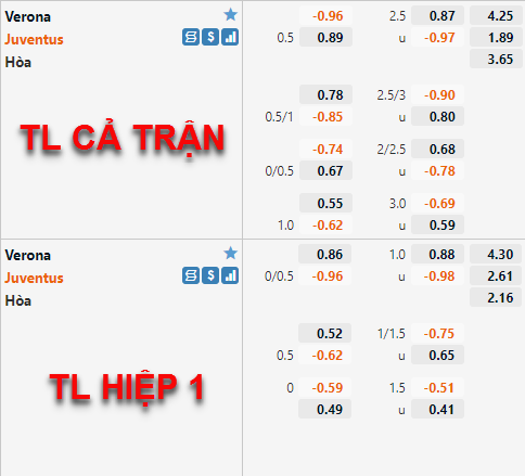 Không có dịch chuyển nào đáng kể về handicap khi Juventus vẫn chấp hòa với điểm ăn thấp. Trong khi đó thì mức tài xỉu vẫn là 2 1/2 nhưng điểm ăn cho cửa tài đã từ mức ăn ít lên mức bỏ.