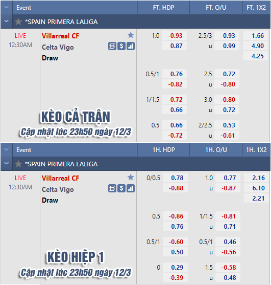 * Chốt kèo trận Villarreal vs Celta Vigo (00h30 ngày 13/03)