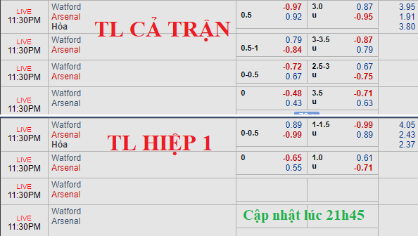 Trên thị trường châu Á, Arsenal vẫn giữ được kèo chấp hòa nhưng thay vì điểm bỏ như lúc 9h sáng nay thì trước giờ bóng lăn chừng 45p, lợi nhuận cho cửa Pháo thủ đã thấp hơn so với chủ nhà. Điều đáng quan tâm là mốc tài xỉu 3 hòa chứng kiến lợi nhuận cho cửa tài giảm từ 0.94 về còn 0.87. Cả 2 đội đều không mạnh ở khả năng phòng ngự và với cách bố trí đội hình như vậy thì kịch bản tưng bừng là điều đáng được chờ đợi.