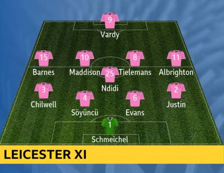 Leicester XI: Schmeichel, Justin, Chilwell, Soyuncu, Evans, Tielemans, Vardy, Maddison, Albrighton, Barnes, Ndidi.