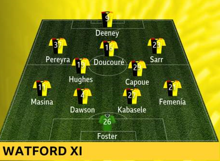 Watford XI: Foster, Dawson, Deeney, Masina, Doucoure, Femenia, Hughes, Sarr, Kabasele, Capoue, Pererya.