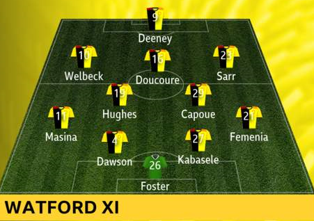 Watford XI: Foster, Femenia, Kabasele, Dawson, Masina, Capoue, Hughes, Sarr, Doucoure, Welbeck, Deeney.