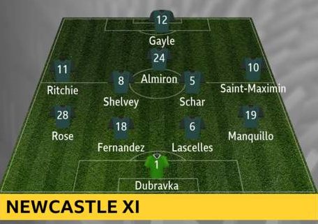 Newcastle XI: Dubravka, Manquillo, Lascelles, Fernandez, Rose, Saint-Maximin, Schar, Shelvey, Ritchie, Almiron, Gayle.